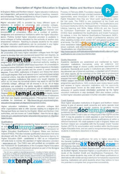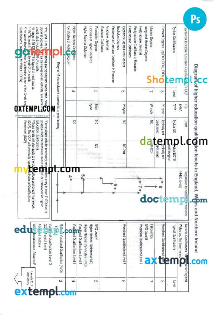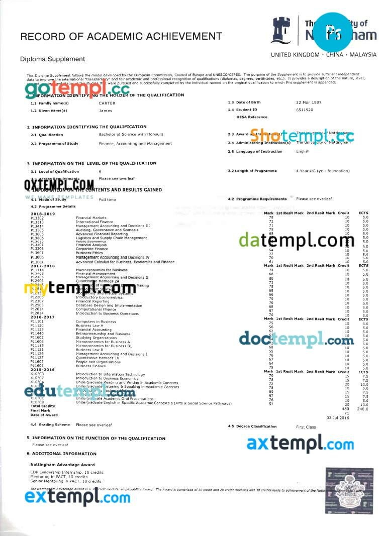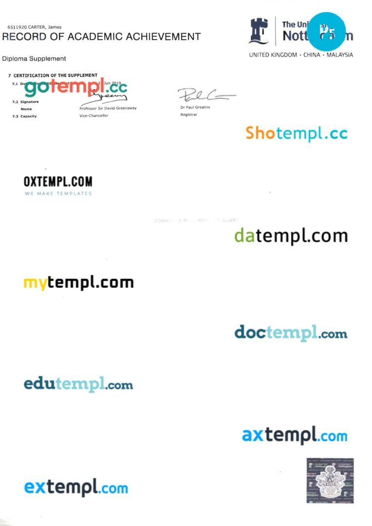 United Kingdom Nottingham university transcript in PSD format, 5 pages